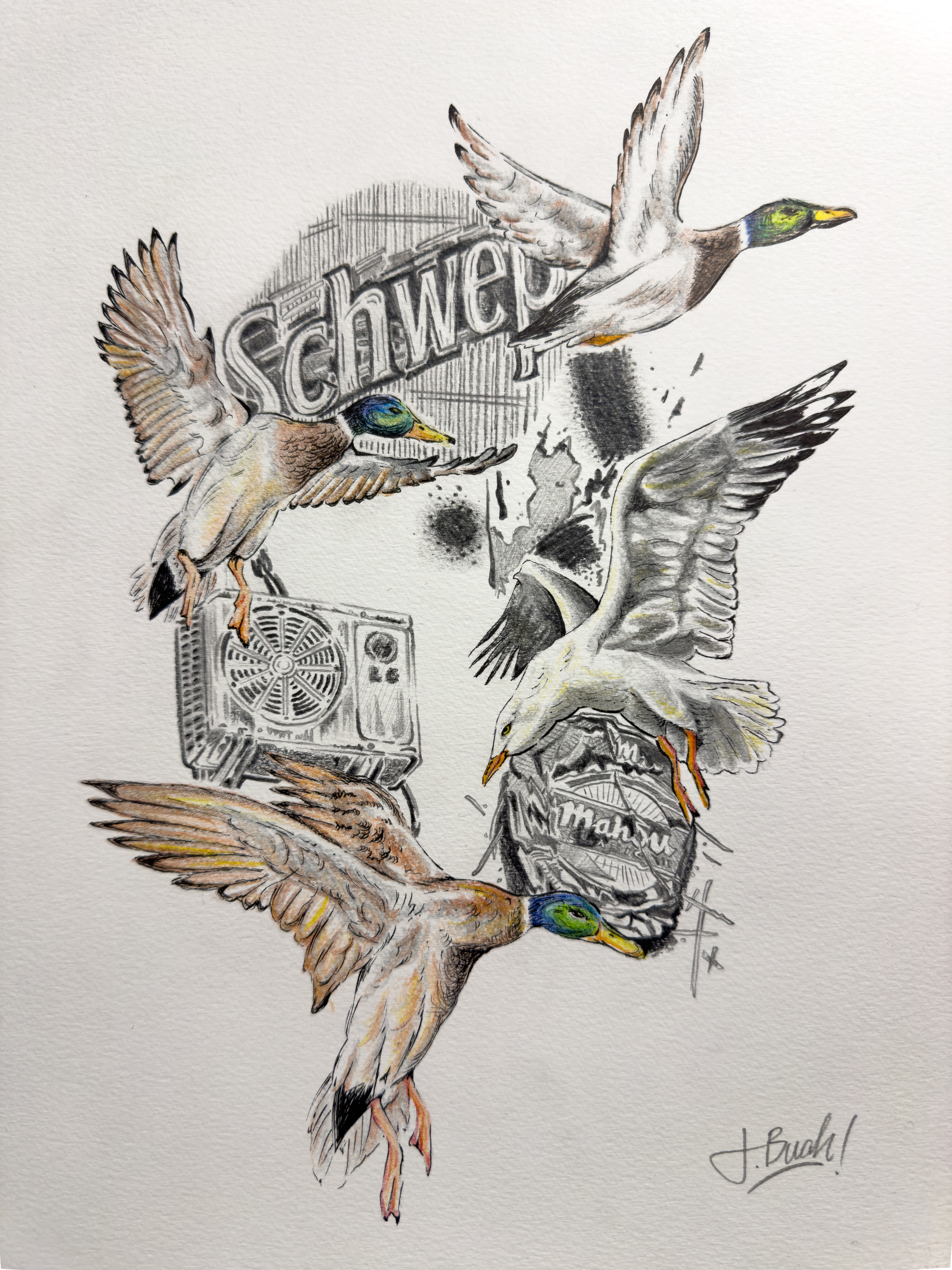 "Fuera de lugar 2" Original. Técnica mixta, acrílico, grafito y marcador. sobre papel de esbozo. 29,7 x 42 cm.